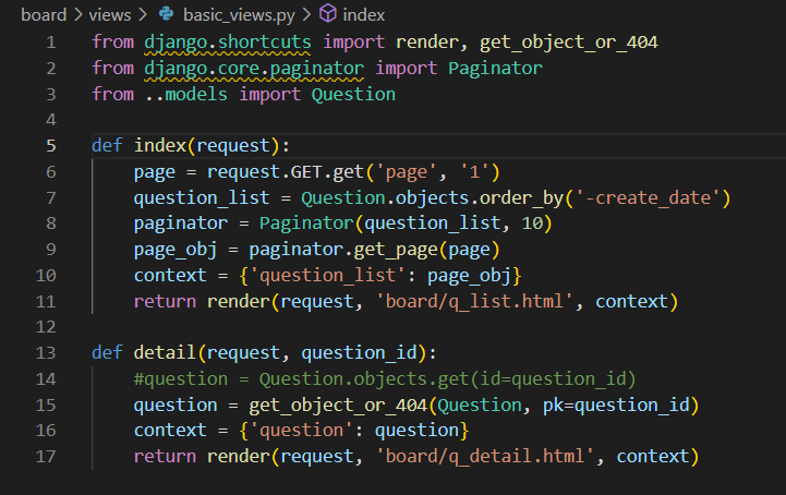 board-views.py에 있던 index, detail함수를 basic.py로 복사시켜준다.