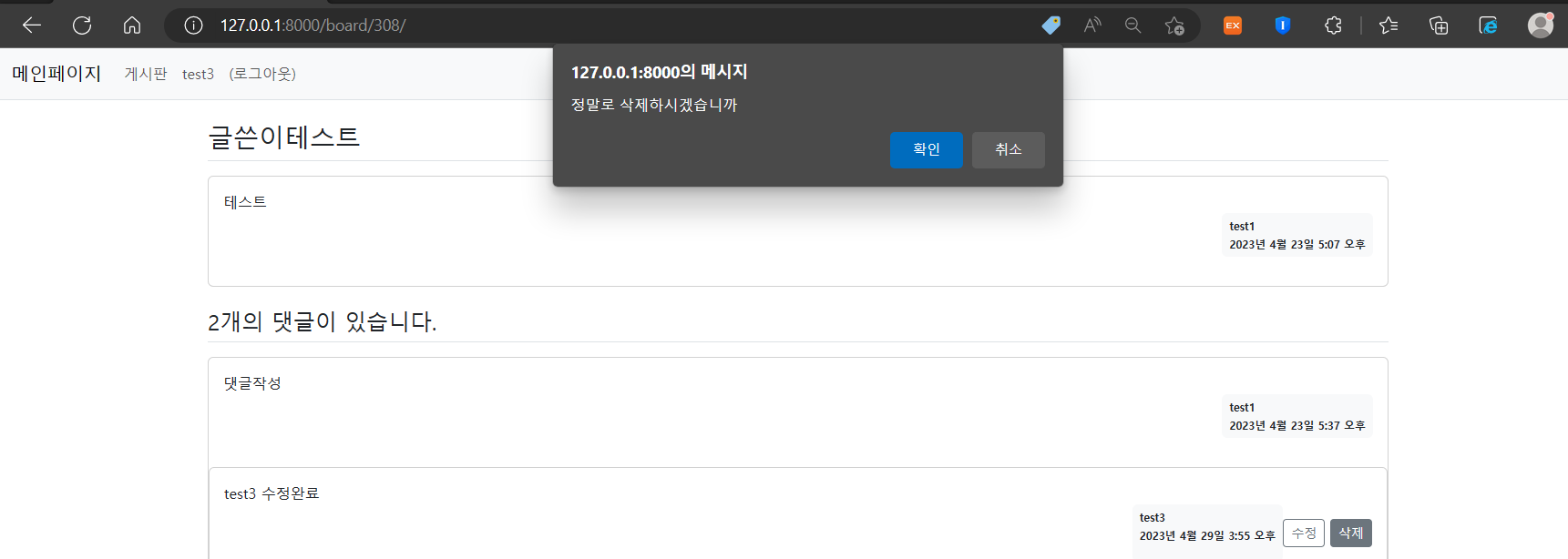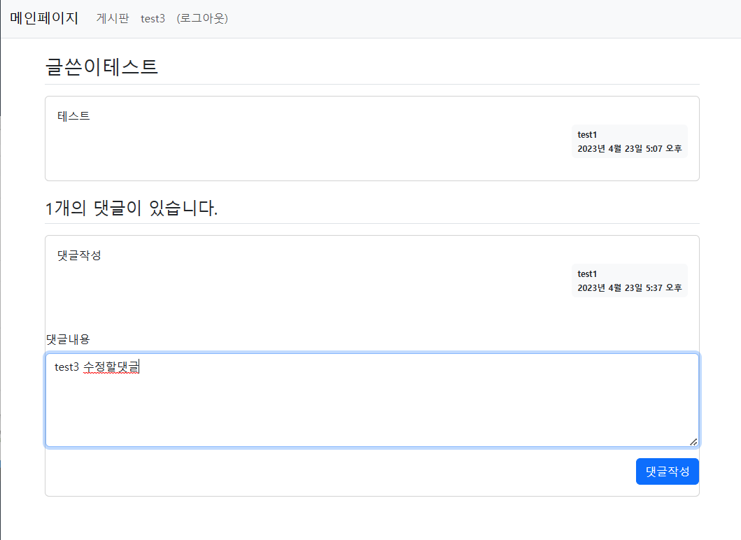 test3로 로그인을 했기에 작성자와 유저가 일치해야 댓글이 수정,삭제된다.